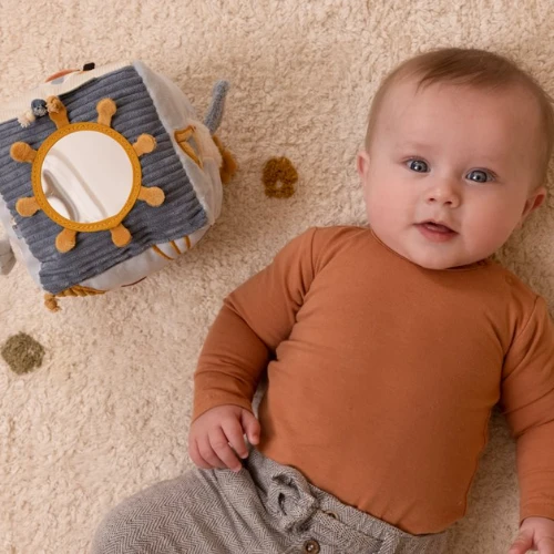 Life around the lighthouse. An array of textures, sounds , and bay-inspired characters comes together on this super-soft activity cube. Every panel offers a different activity that stimulates hand-eye coordination and will keep your little one engaged. There’s so much to grasp and touch, ranging from a cheeky seagull with cotton rope legs and a pelican with a fish in his beak to a mirror for self-discovery.