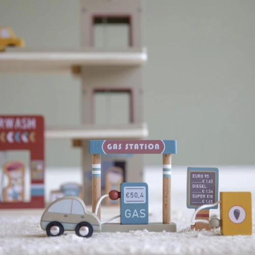 Stop by the garage to fill up on gas, park your car or get it cleaned in the carwash. The wooden garage is one of the many playsets that can be connected to the Little Dutch railway set. The garage includes a helicopter platform and the wooden figurines and elements all have detailed illustrations on both sides. Complete the garage with the railway train XXL set and additional extension sets for hours of fun play.