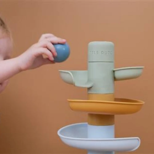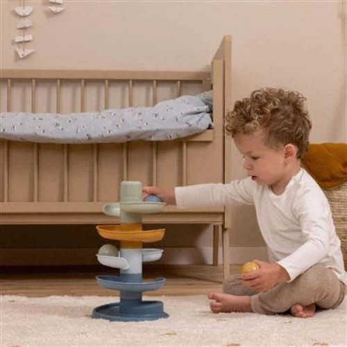 Let’s get the ball rolling! This captivating Spiral Tower makes for endless excitement. The colourful toy consists of 5 soft-hued pieces that your little one can easily stack. Drop the balls one by one onto the top tier and see how each of them winds and rolls down. The Spiral Tower enhances hand-eye coordination and teaches a child the concept of cause and effect, ensuring it’s both fun and educational. The Spiral Tower comes with three big easy-to-grip balls in different colours that make a little sound when moving.